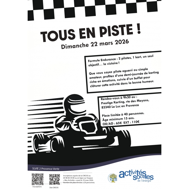 Que vous soyez pilote aguerri ou simple amateur, profitez d'une demi-journée de karting riche en émotions, suivie d'un buffet pour clôturer cette activité dans la bonne humeur.